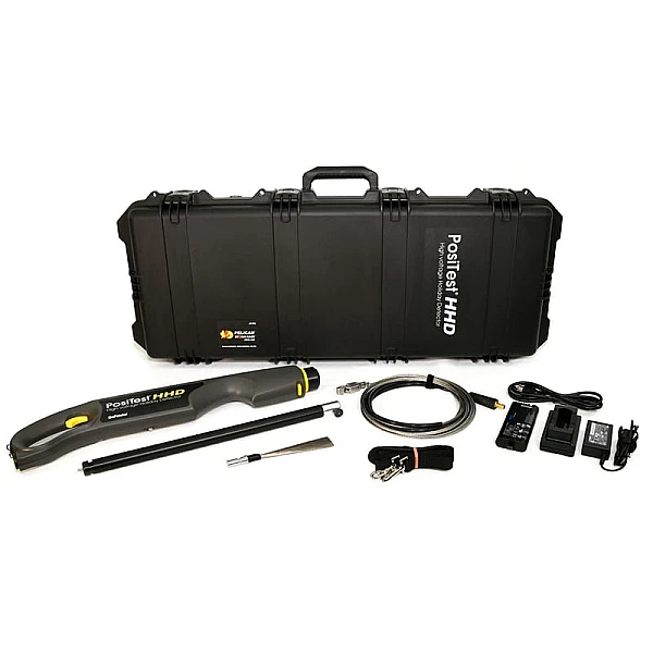 Электроискровой дефектоскоп DeFelsko PosiTest HHD предназначен для выявления трещин, пористости, недопустимых утонений и других нарушений сплошности внутренних и внешних защитных диэлектрических покрытий (лакокрасочных, порошковых, пленочных, битумных и других диэлектрических покрытий толщиной до 20 мм на металлических изделиях приложением импульсного высоковольтного напряжения и фиксацией электрического пробоя в местах нарушения сплошности или недопустимого утонения.