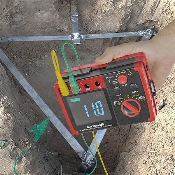 Цифровой прибор МЕГЕОН 13122 используется для определения сопротивления заземления по 2-проводной или 3-проводной схеме. Для дополнительной безопасности изделие оснащено измерителем напряжения земли (шаговое напряжение). Применяется специалистами для диагностики, технического обслуживания и ремонта различных заземляющих систем, электроустановок, распределительных устройств и УЗИП, а также другого электрического оборудования. Диапазоны измерений выбираются вручную. Предусмотрено удержание текущих показаний на дисплее. Модель имеет встроенное хранилище на 20 результатов.