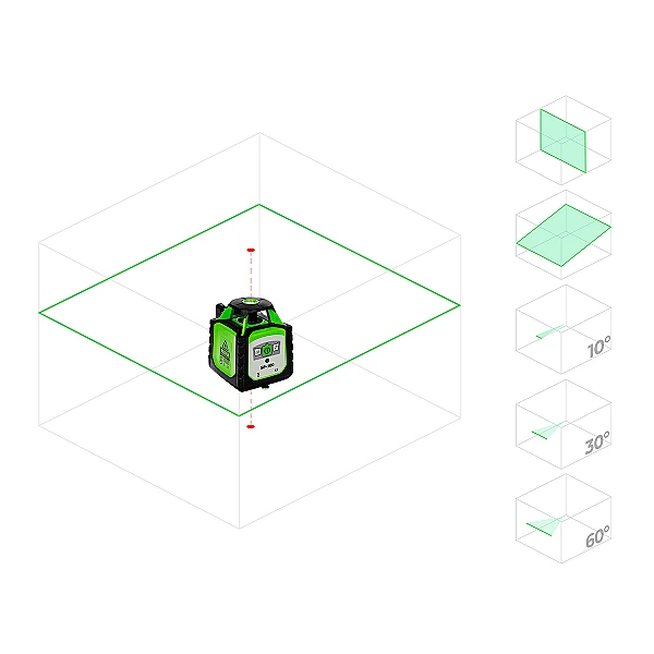Лазерный нивелир RGK SP-610Gоснащен компенсатором, который автоматически устанавливает уровень в горизонтальной плоскости. Вам нужно лишь установить лазерный нивелир на штатив или ровную поверхность и включить его, после чего система самовыравнивания не только точно выставит уровень, но и будет следить за его состоянием. В случае отклонения уровня более чем на 4° сработает сигнализация, избавив вас от исправления ошибочной разметки.