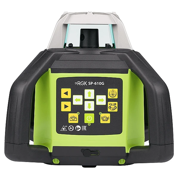 Ротационный нивелир RGK SP-610Gотличается очень простым в освоении управлением: все кнопки на передней панели прибора снабжены интуитивно понятными графическими символами. Корпус нивелира выполнен из прочного пластика и оснащен резиновыми накладками для дополнительной защиты от пыли и влаги. Удобная ручка позволит вам легко переносить нивелир с места на место, не помещая его в транспортировочный кейс. На нижней части нивелира имеется резьба для установки на штатив, а специальное настенное крепление позволит вам установить лазерный нивелир на вертикальной поверхности. Один комплект аккумуляторов обеспечивает до 24 часов непрерывной работы.