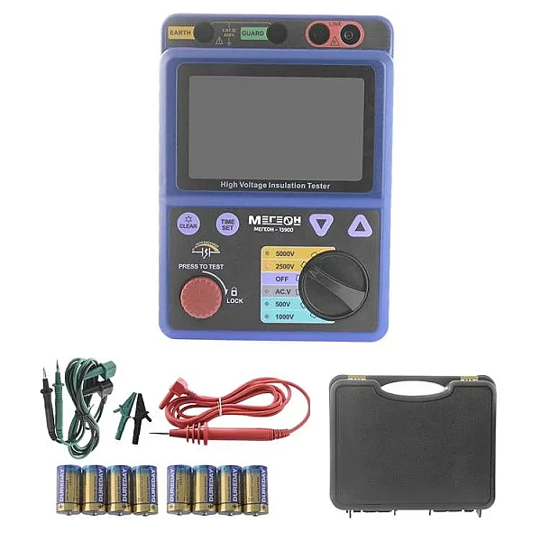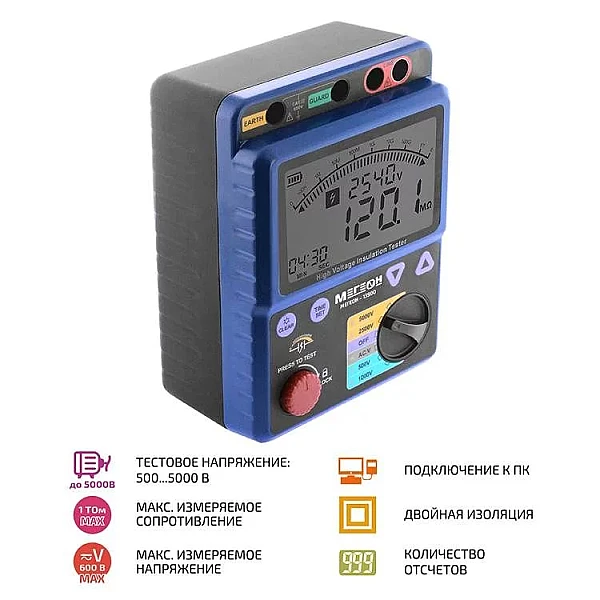 Портативный цифровой измеритель МЕГЕОН 13900 используется для определения сопротивления изоляции, а также для измерения постоянного/переменного напряжения и индекса поляризации (PI). Применяется профессиональными работниками для диагностики, техобслуживания и ремонта разных электрических двигателей, электроустановок, оборудования и выключателей. Устройство снабжено функцией автоматического переключения измерительных диапазонов (от 2 до 5). Присутствует звуковая и визуальная сигнализации подачи испытательного напряжения и авторазряда цепи после замера. Прибор имеет возможность автосохранения измеренных результатов на внутреннюю память.
