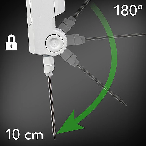 Удобный термометр 2-в-1 поставляется с откидным проникающим зондом, изготовленным из пищевой, нержавеющей стали, и инфракрасным датчиком для бесконтактных измерений температуры поверхности. Идеально подходит для мяса, рыбы, теста или жидкости и измеряет температурный диапазон от -40 °C до + 200 °C (Нельзя использовать для твердых или замороженных продуктов!).