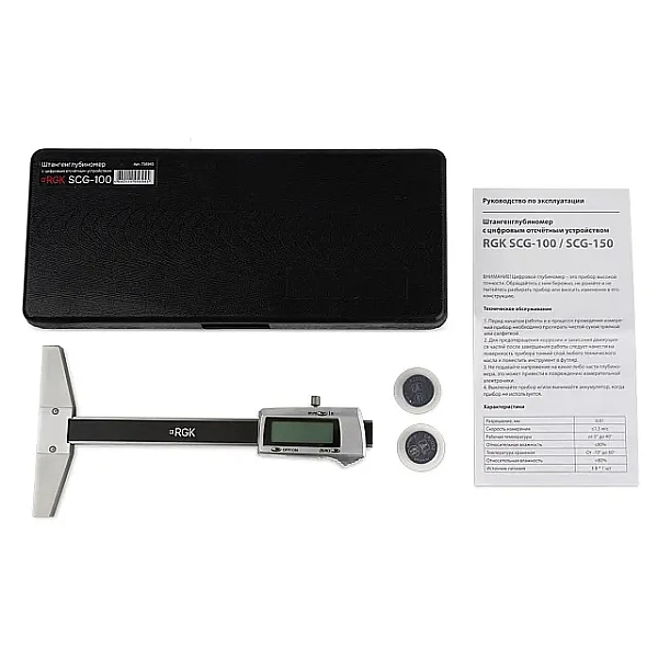 Цифровое отсчетное устройство с дискретностью 0,01 работает в метрической и британско-американской системах мер, переключаемых нажатием одной кнопки, выдавая результаты в миллиметрах или дюймах. Для питания RGK SCG-100 используется 3-вольтовый элемент типа CR2032.