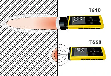 Trotec T610 идеально подходит для комбинированных измерений в зданиях с помощью прибора для измерения влажности материала T660. Благодаря комбинированному измерению подповерхностной влажности с T610 и приповерхностной влажности с T660 можно различать, сужать и классифицировать сложные корреляции, например гигроскопические явления влажности, возникающие в результате засоления или утечек. В ходе этого T660 захватывает верхние два-четыре см строительного материала, а T610 измеряет объемные значения влажности до глубины 30 см.